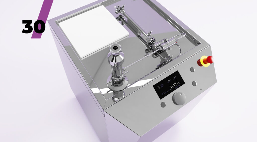 Its compact size and quiet operation do not compromise its capabilities in terms of maximum pressure and flow rate. The PSI-30 is just great for lab work, with batches as small as 100ml, but is also an excellent small-scale production workhorse, even in continuous process configurations, with a dead volume of 15ml. The choice of the best materials and finishing make the PSI-30 suitable for every industry, including the most demanding pharmaceutical, biochemical and food processing environments.
